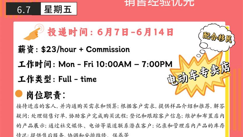 【168新岗】密西电动车专卖店请Sales Secretary 1名(可移民)
