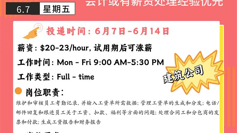 【168新岗】士嘉堡建筑公司招聘Payroll Specialist 1名