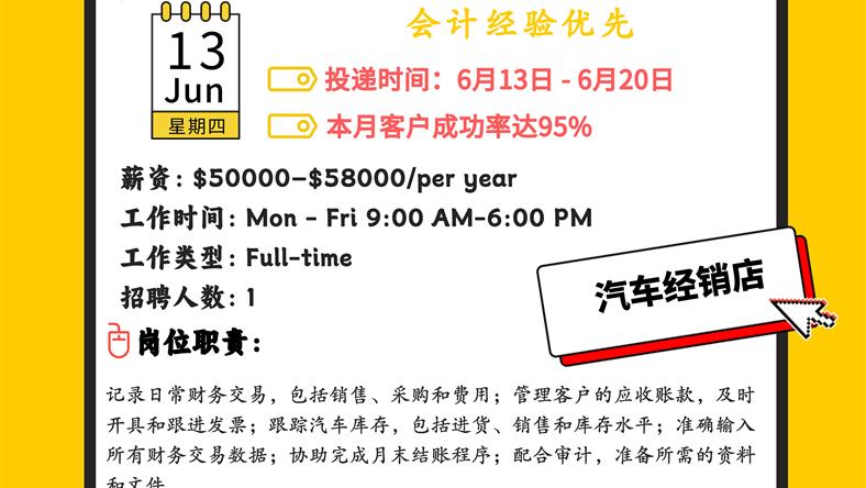 【168新岗】密西汽车经销店招聘Accounting Clerk 1名
