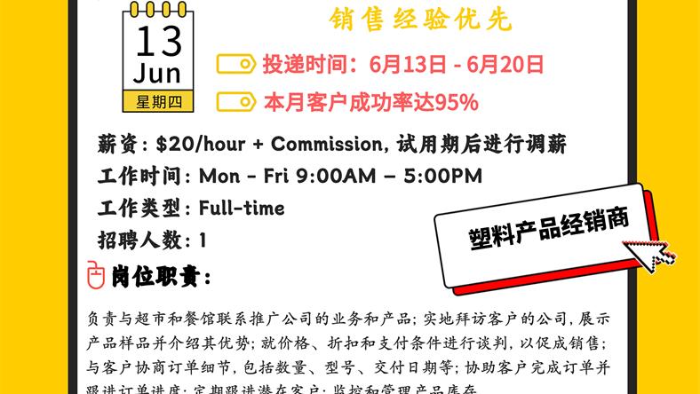 【168新岗】北约克塑料产品经销商请Sales Associate 1名
