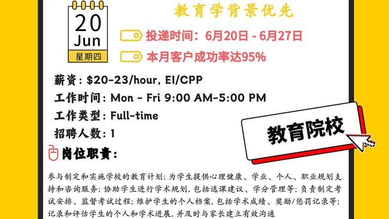 【168新岗】列治文山教育院校招聘Guidance consoler 1名