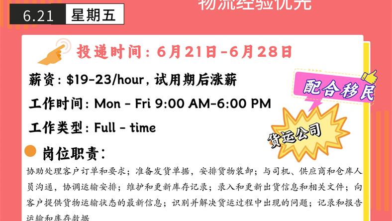 【168新岗】密西货运公司请Logistics Operator 1名 (可移民)