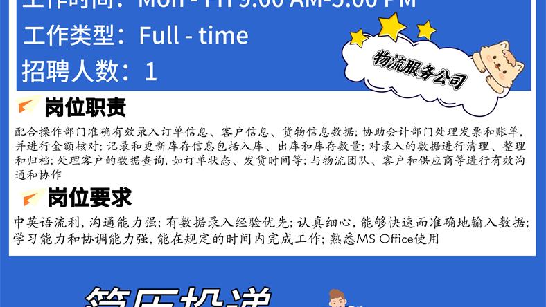 【168新岗】北约克物流服务公司招聘Data Entry Clerk 1名