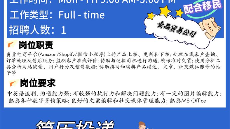 【168新岗】密西食品贸易公司招聘E-Commerce Specialist 1名 (可移民)