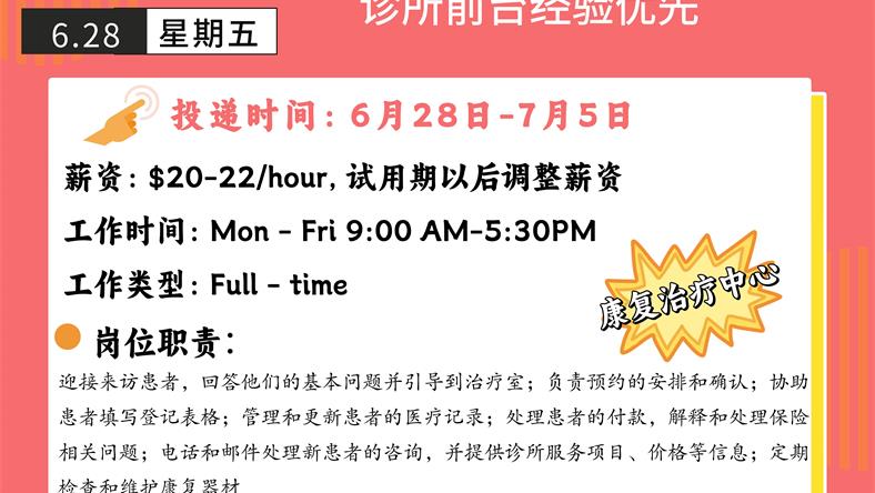 【168新岗】密西康复治疗中心招聘Clinic Receptionist 1名