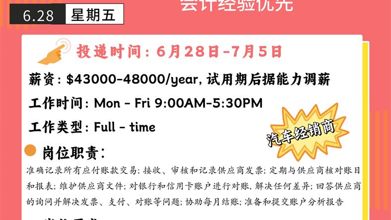 【168新岗】Downtown汽车经销商招聘Accounts payable clerk 1名