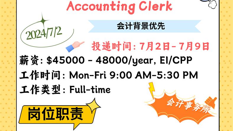 【168新岗】多伦多会计事务所招聘Accounting Clerk 1名