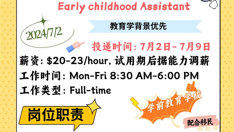 【168新岗】列治文山学前教育学校招聘Early Childhood Assistant 1名(可移民)