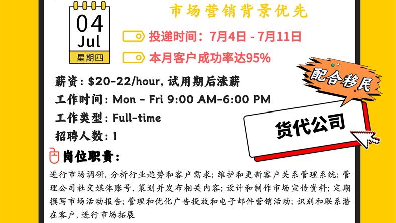 【168新岗】士嘉堡货代公司招聘Marketing Specialist 1名(可移民)