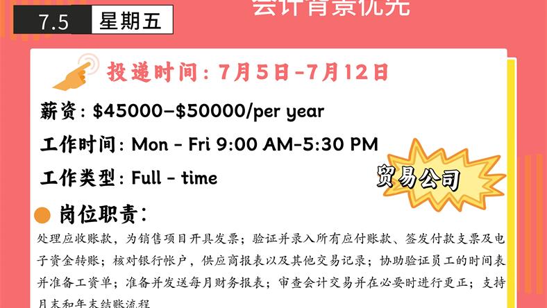 【168新岗】北约克贸易公司招聘Junior Accountant 1名