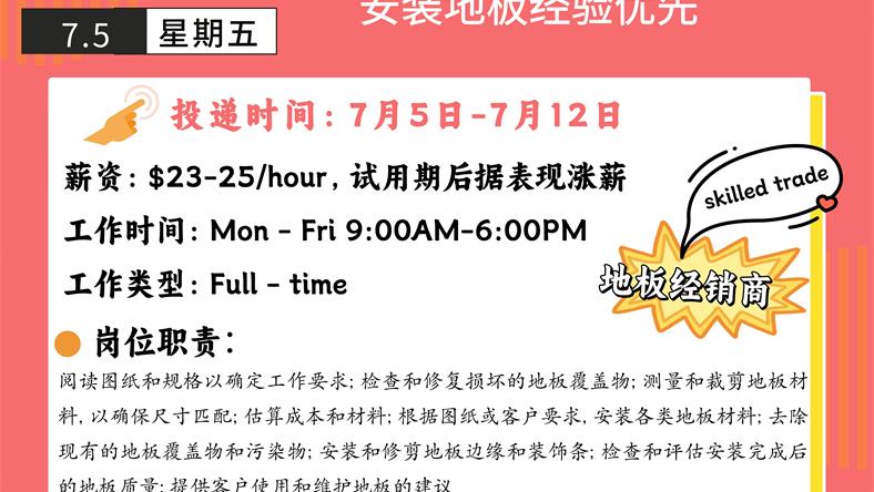【168新岗】士嘉堡地板经销商招聘Floor Covering Installer 1名(skills trade +可移民)