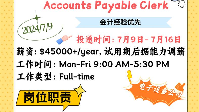 【168新岗】士嘉堡电子设备公司招聘Accounts payable clerk 1名