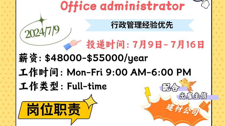 【168新岗】万锦建材公司招聘Office administrator 1名 (可移民)