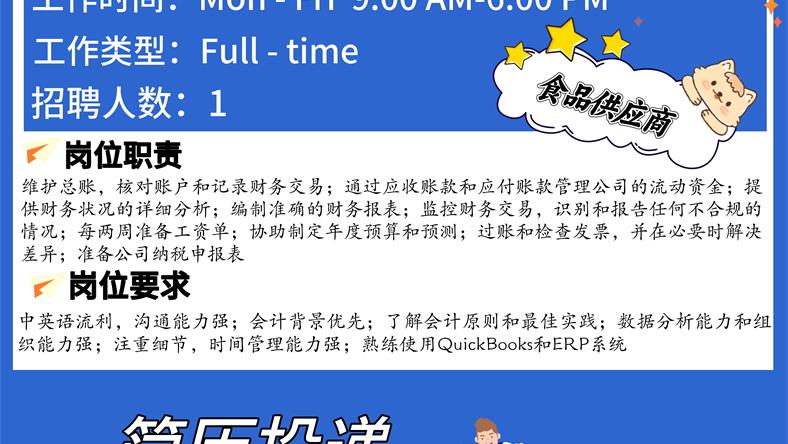 【168新岗】士嘉堡食品供应商招聘Senior Accountant 1名