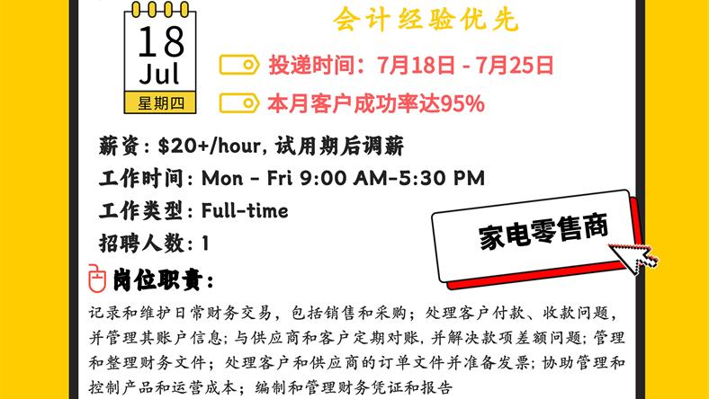 【168新岗】士嘉堡家用电器零售商招聘Junior Accountant 1名