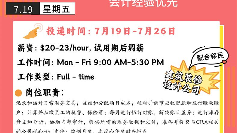 【168新岗】士嘉堡建筑装修与设计公司招聘Bookkeeping clerk 1名(可移民)
