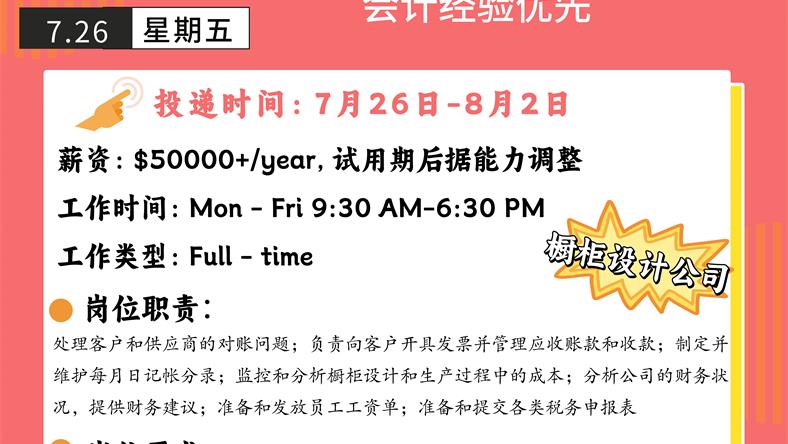【168新岗】士嘉堡橱柜设计公司招聘Senior Accountant 1名
