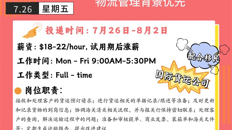 【168新岗】北约克国际货运公司招聘Freight Operator 1名(可移民)