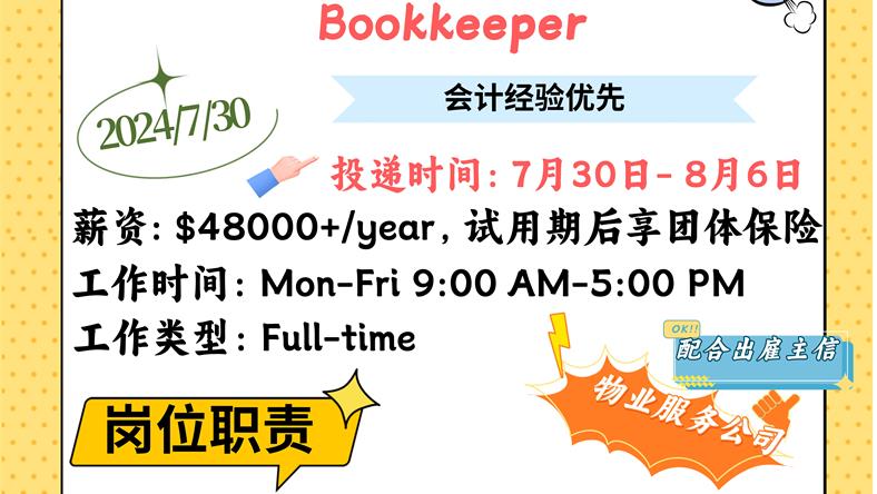 【168新岗】多伦多物业服务公司招聘Bookkeeper 1名 (可移民)